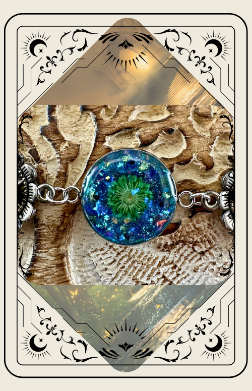 This exquisite bracelet showcases a stunning combination of blue and green flowers, embodying profound spiritual significance. The soothing, protective energy of blue harmonizes beautifully with the revitalizing, grounding essence of green, symbolizing serene growth and spiritual healing. This pairing is frequently linked to the heart (green) and throat (blue) chakras, inspiring individuals to express their truth from a foundation of love and inner tranquility.